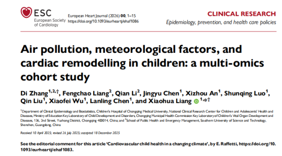 近日,附属儿童医院梁小华团队在国际心血管顶刊European Heart Journal发表题为“Air pollution, meteorological factors, and cardiac remodelling in children: a multi-omics cohort study”的研究论文,通过前瞻性多中心队列研究首次系统地探讨了中国西南地区环境暴露(PM2.5)和气象因素(温度、相对湿度、极端温度事件)对儿童心血管结构及功能重塑的影响,并探索了潜在的多组学生物学机制,强调了从生命早期进行心血管疾病预防的重要性。