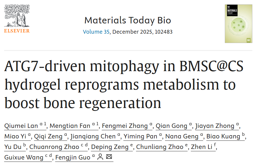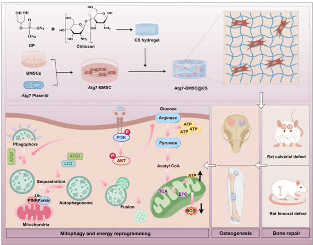 近期,我校基础医学院郭风劲教授研究团队利用ATG7(Autophagy-related gene 7)基因修饰的干细胞和基因敲除小鼠,同时联合液-凝转变的壳聚糖水凝胶,成功实现了骨组织的再生修复,并揭示了线粒体自噬与线粒体能量代谢重编程在促进成骨中的关键作用。研究成果以题为ATG7-Driven Mitophagy in BMSC@CS Hydrogel Reprograms Metabolism to Boost Bone Regeneration的论著形式发表在Materials TodayBio。