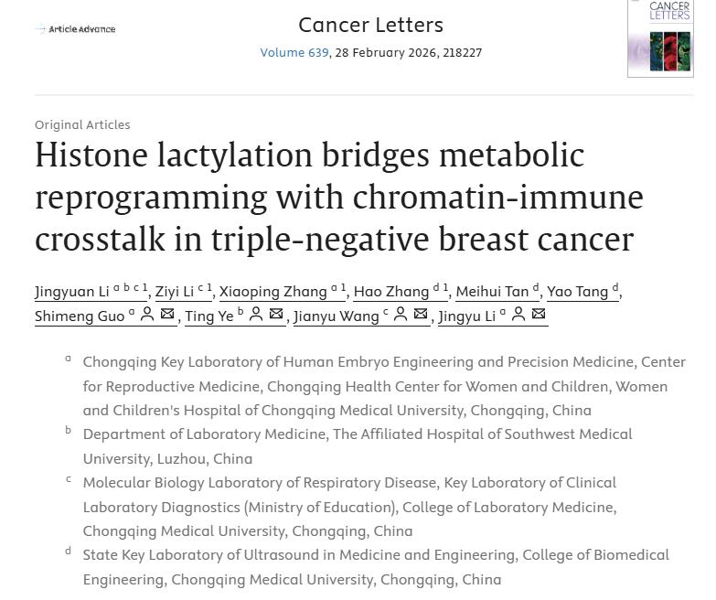 近日,我校附属妇女儿童医院李竞宇/郭诗萌团队联合检验医学院王健宇以及西南医科大学附属医院叶婷团队在Cancer Letters期刊发表了题为Histone lactylation links metabolic reprogramming to gene regulation in triple-negative breast cancer的研究论文。