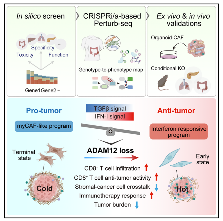 该研究构建了从靶点发现到机制验证的完整范式,揭示了CAF可被干预的重编程途径,发现了ADAM12这一在正常组织中表达极低、兼具高效性与潜在安全性的新型治疗靶点,为克服免疫治疗耐药、特别是改造“冷肿瘤”微环境提供了全新的策略与希望。